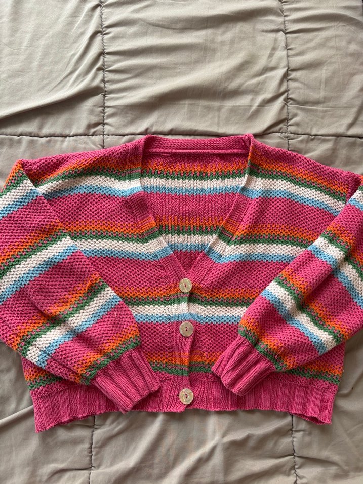 Renkli çizgili desenlere sahip, bol kesim uzun kollu ve V yaka örgü kadın hırka, rahat ve bohem tarz sunar.