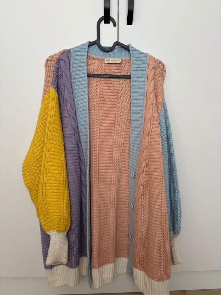 Rahat kesim, örgü kumaştan yapılmış, uzun kollu ve yuvarlak yakalı pastel renklerde bohem tarzı kadın hırka.