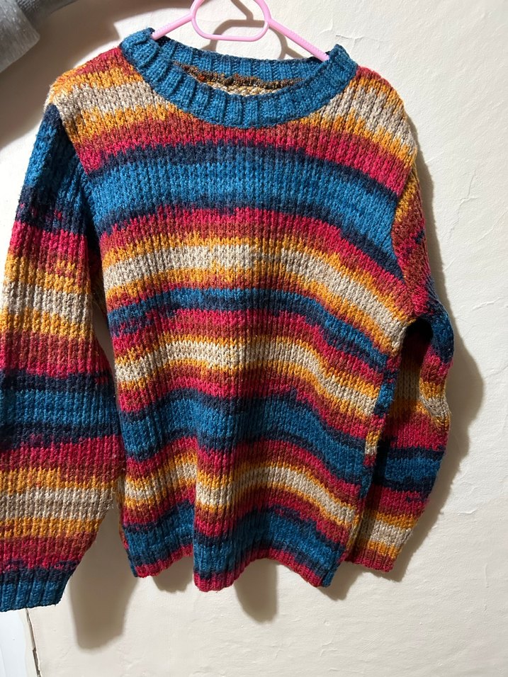 Renkli örgü kadın kazak, yuvarlak yaka ve uzun kolludur. Salaş kesimi ve rahat bohem tarzıyla günlük kullanıma uygundur. El örgüsüdür 36-38 beden uyumludur