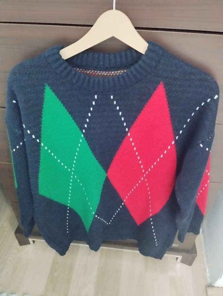 Renkli örgü kumaştan, yuvarlak yaka ve uzun kollu, bol kesim kadın kazak. Günlük sokak stiline uygun rahat bir parça.