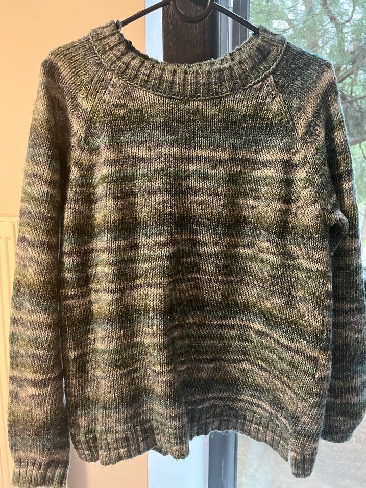 Bu kadın kazağı, örgü yün kumaş, yuvarlak yaka ve uzun kollara sahiptir. Rahat kesim ve normal uzunlukta, sade ve rahat bir stile sahiptir.