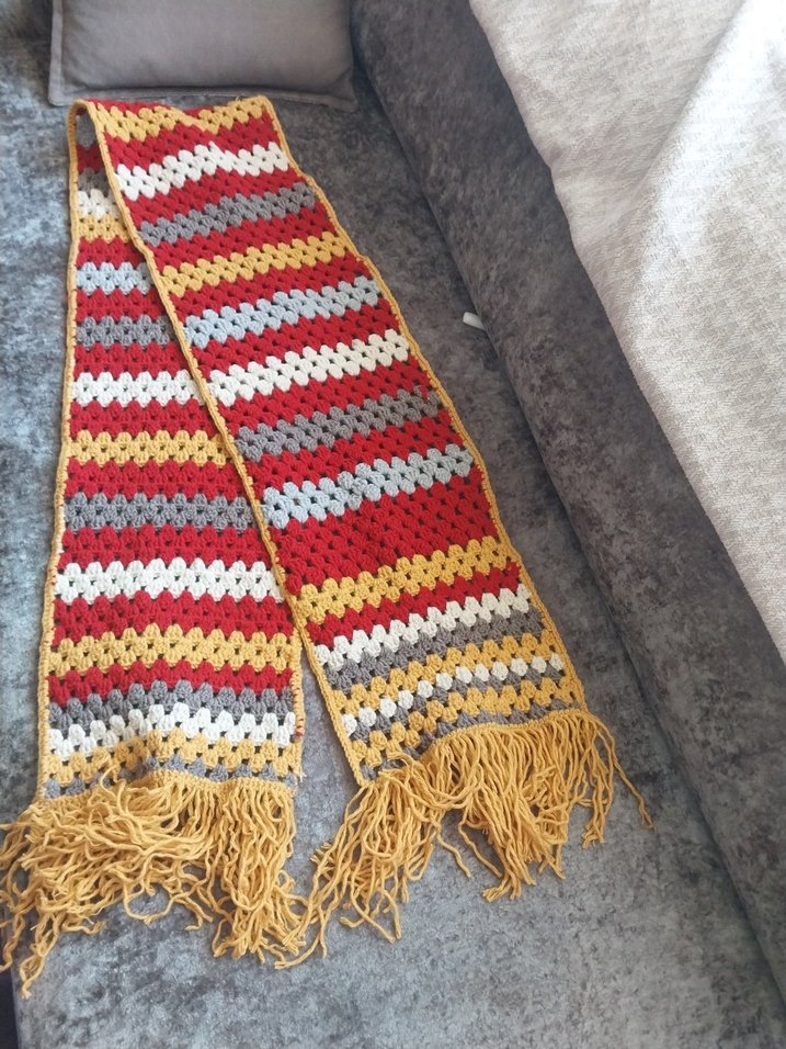 Renkli çizgili, püsküllü uçlara sahip örgü kadın şalı. Yumuşak örgü kumaştan, rahat ve sıcak tutar.
