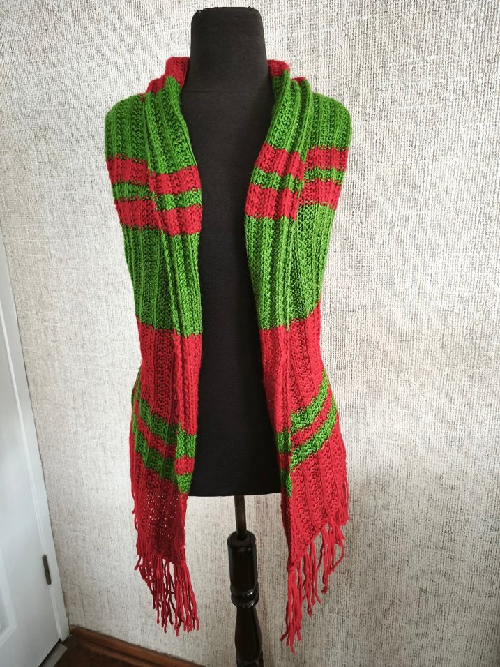 yünlü iplikten elde örülmüş, canlı yeşil ve kırmızı çizgili, püsküllü renkli kadın şalı, rahat bohem tarzı için uygundur.
