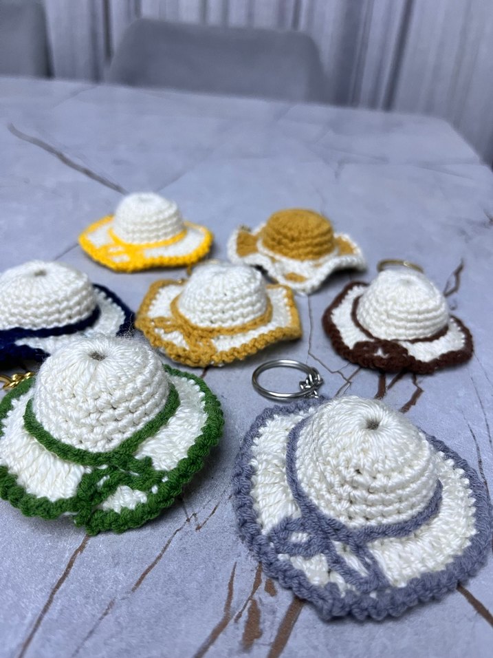 Renkli örgü bohem şapka şeklinde anahtarlıklar, anahtarlarınıza rahat ve retro bir hava katar.