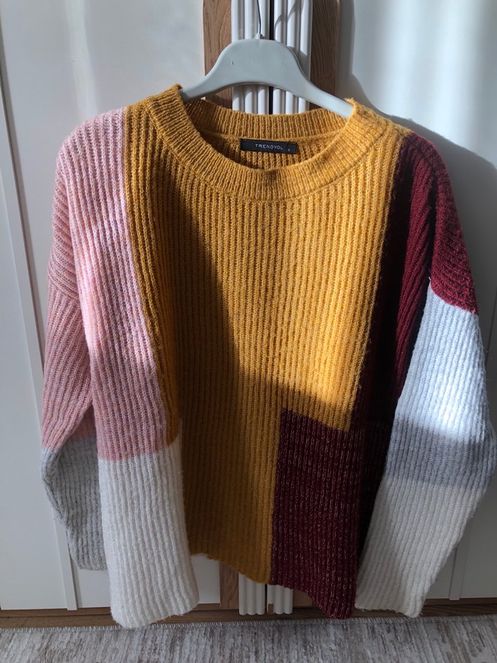 Kadınlar için bol kesim ve uzun kollu, yumuşak örgü triko kazak. Yuvarlak yaka ve hafif çok renkli blok desenlidir, gündelik sokak stili için uygundur.