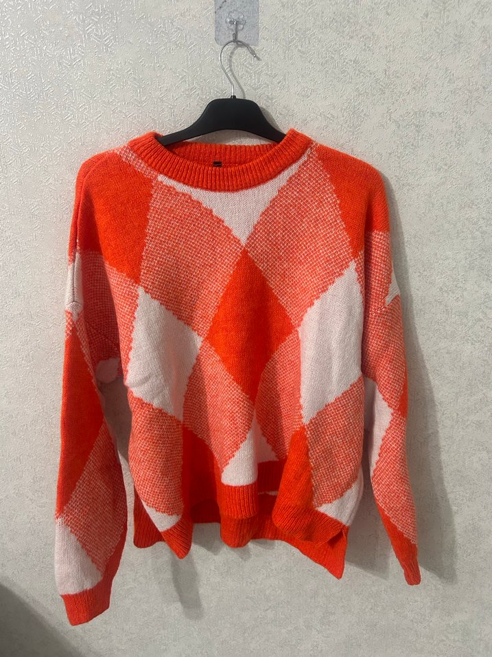 Renkli batik desenli, yuvarlak yakalı ve uzun kollu örgü kadın triko kazak. Salaş kesim ve normal boyda, günlük sokak stiline uygun.