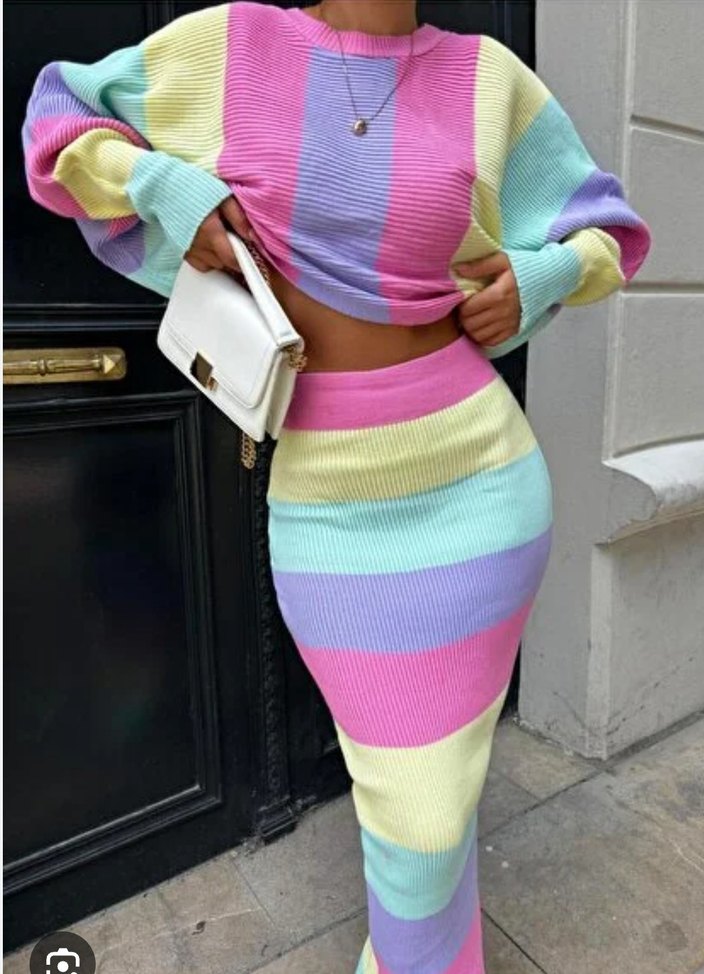 Fitted kesim, uzun kollu ve bisiklet yakalı, pastel tonlarda tie-dye desenli örgü uzun elbise. Rahat ve şık bir sokak stili için uygundur.