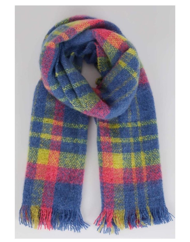 Canlı çizgili, püsküllü kenarları olan örgü yün kadın şalı. Rahat, bohem tarzda, retro ve hippie görünüme uygundur. Defacto markalı 45x200
