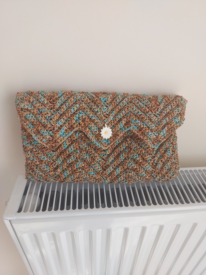 Kahverengi ve turkuazın karışımı renklerde, papatya düğmeli renkli örgü bohem tarzda portföy çanta.