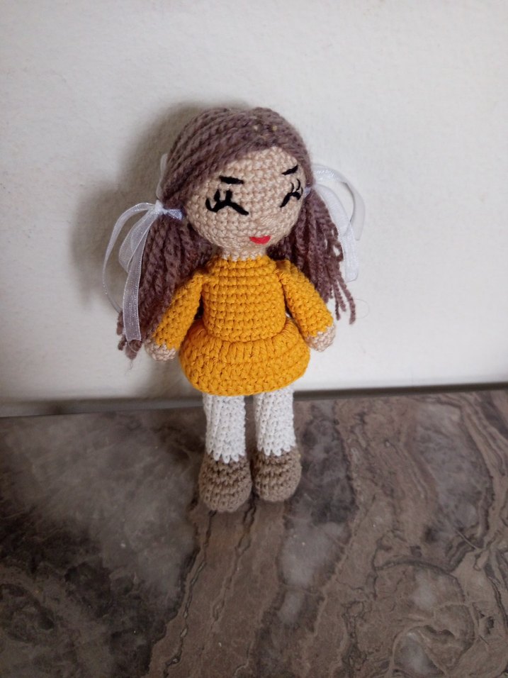 Kahverengi saçlı, sarı elbiseli ve beyaz taytlı renkli örgü bebek. Yüzü nakış detaylı, saçında beyaz kurdeleler var. Bebek boyu 17 cm tek parça örülmüştür koton ip kullanildi