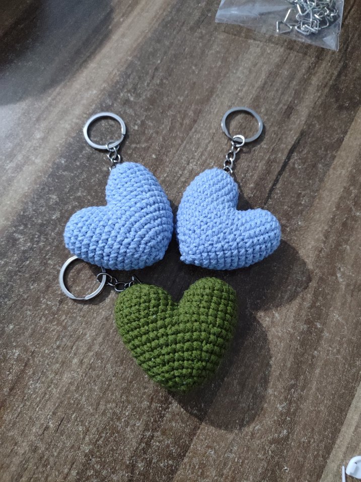 Mavi ve yeşil renklerde, örgü kalp şeklinde, rahat bohem tarzda anahtarlıklar. Yumuşak dokusu el yapımı hissi verir.