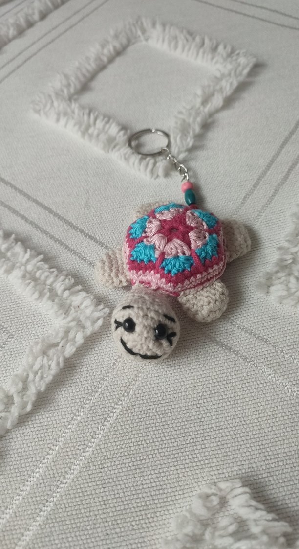 Bohem tarzda, renkli örgü kaplumbağa anahtarlık, sevimli gülümseyen yüz ve yumuşak dokuya sahip.