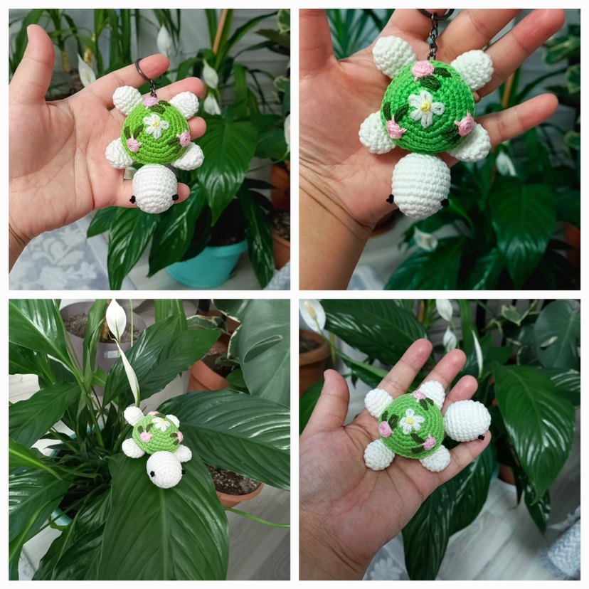 Renkli yeşil kaplumbağa anahtarlık, örgü kumaştan el yapımı olup küçük çiçeklerle süslenmiştir, bohem minimalist tarzı yansıtır.