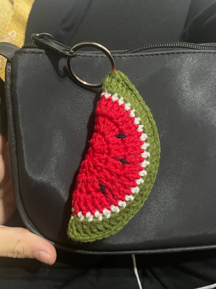 Renkli, örgü karpuz tasarımlı anahtarlık, bohem tarzıyla aksesuarlarınıza retro ve samimi bir dokunuş katıyor.