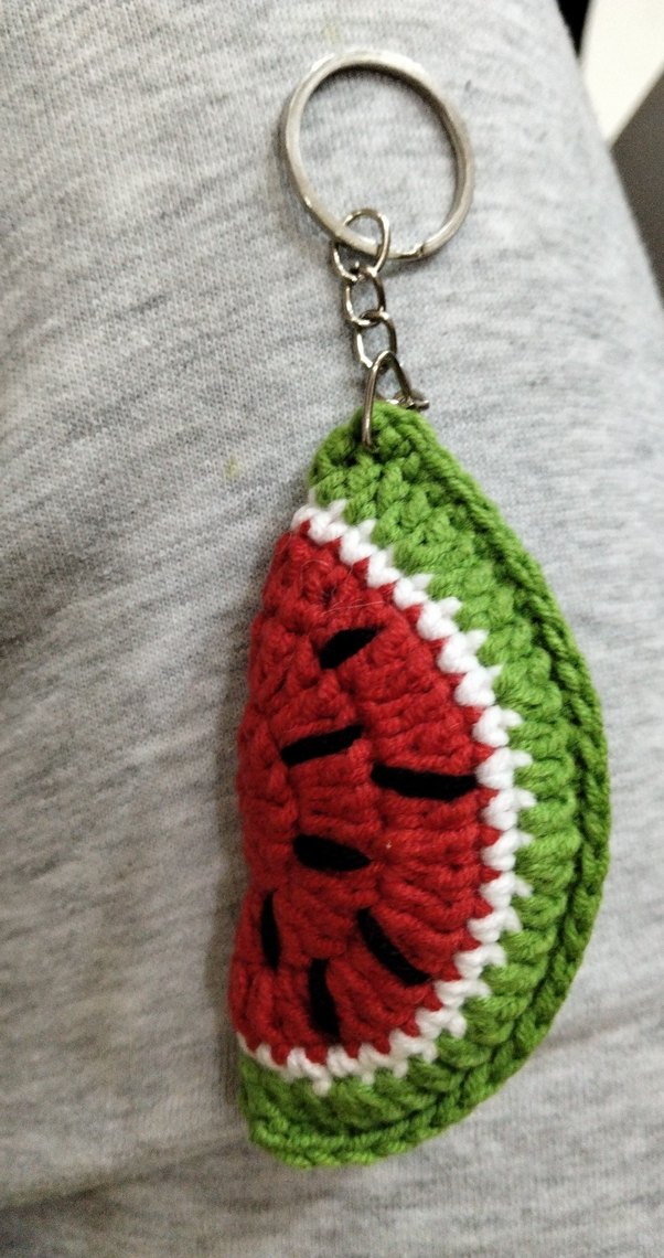 Renkli örgüden yapılmış, karpuz dilimi şeklinde, rahat bohem tarzı anahtarlık. 1 bas parmağı boyunda.