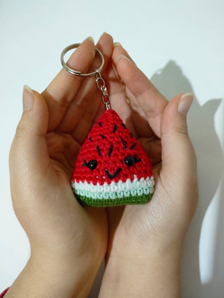 Sevimli yüzlü, renkli örgü karpuz anahtarlık. Rahat ve bohem tarzıyla anahtarlarınıza eğlenceli bir dokunuş katar.