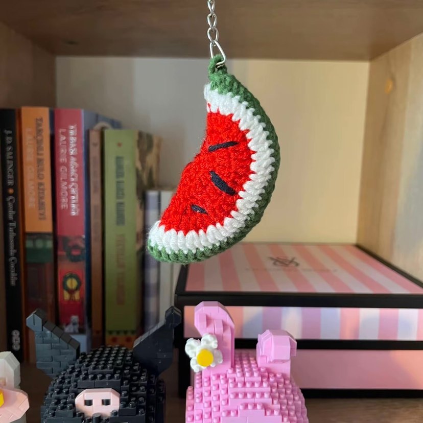 Renkli, örgü karpuz şeklinde anahtarlık. Yeşil, beyaz ve kırmızı renklerle bohem tarzı yansıtıyor.