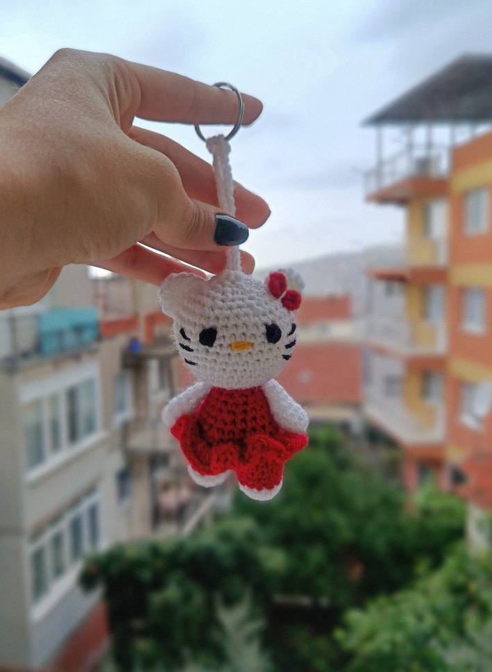 Renkli örgüden yapılmış kırmızı-beyaz kedi figürlü anahtarlık, rahat ve retro tarzı rock punk dokunuşuyla birleştirir.