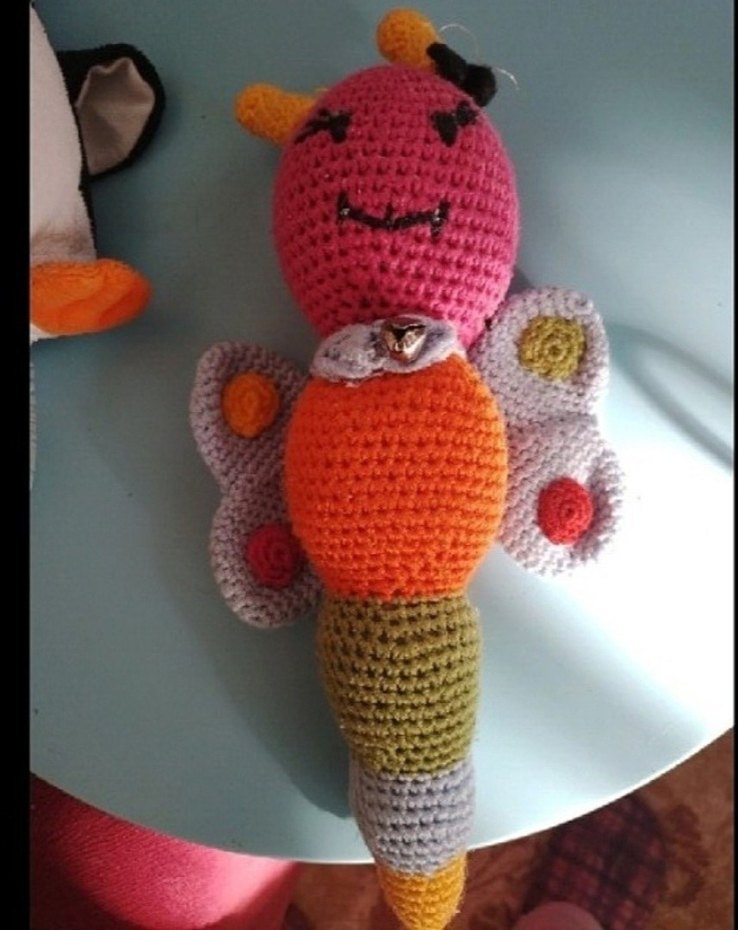 Canlı renklerde, el yapımı örgü kelebek zilli agurimi oyuncak. Detaylı kanatları ve yumuşak dokusu ile dikkat çeker.