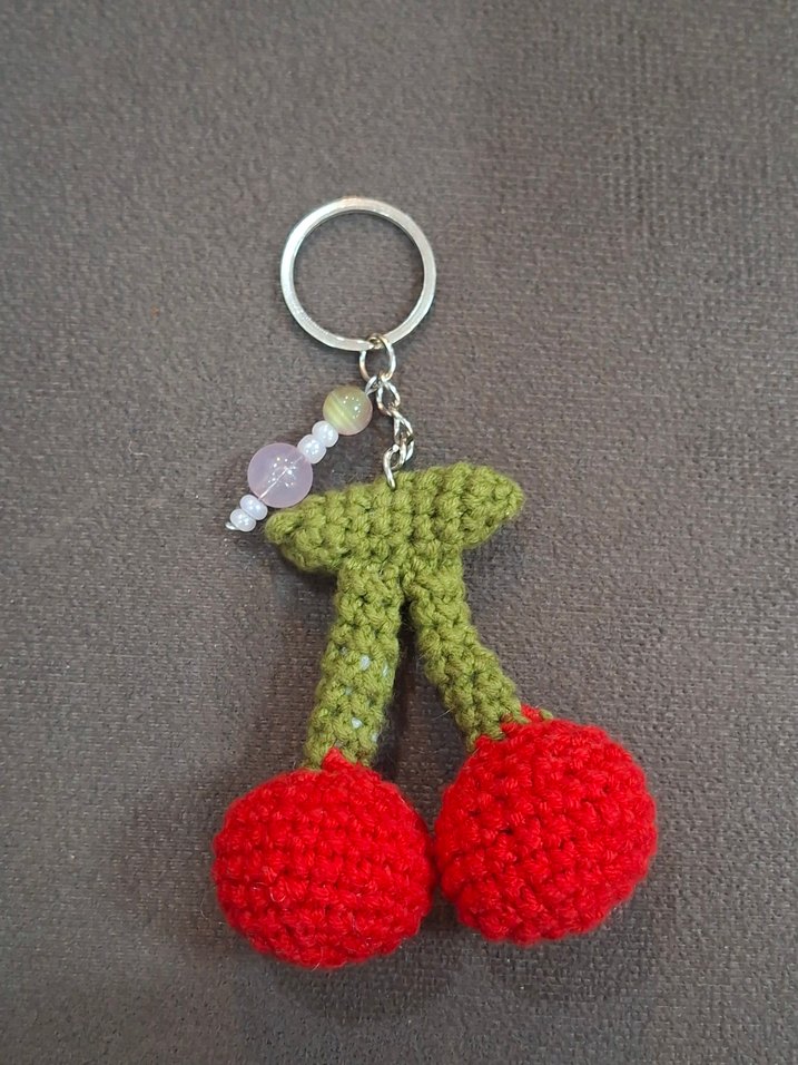 Renkli örgü kirazlardan oluşan, küçük boncuklarla süslenmiş anahtarlık. Bohem tarzına uygun.