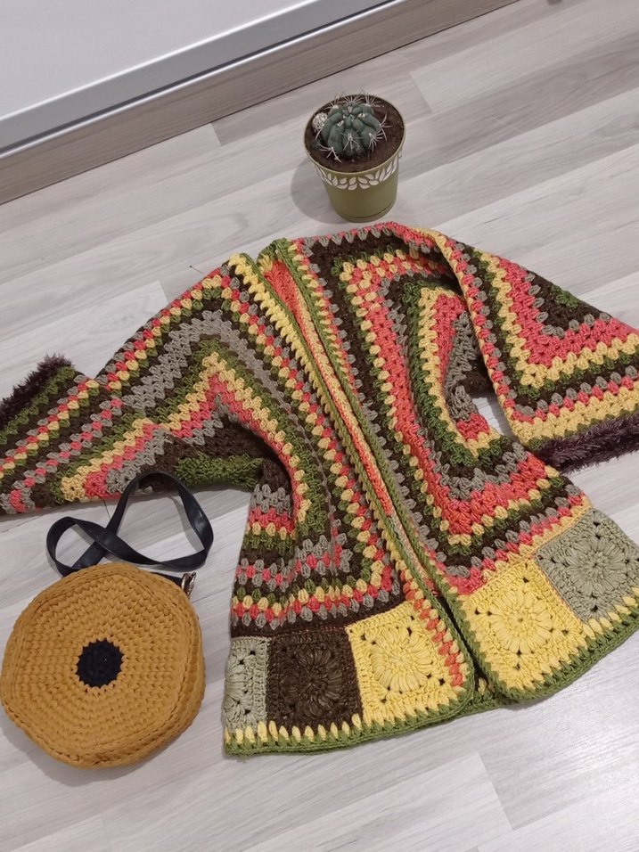 Renkli, kısa kesim, bol kesim ve yuvarlak yakalı örgü hırka, bohem tarzı için uygun.