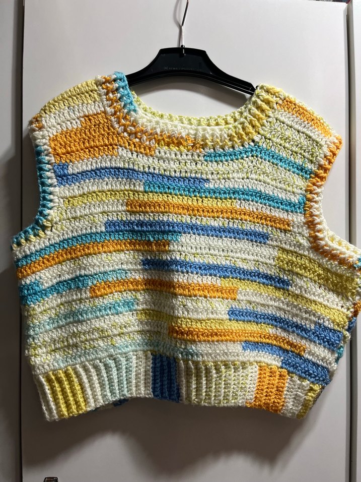 Bu kolsuz, örgü kadın süveteri salaş kesime ve yuvarlak yakaya sahiptir. Kısa boylu, bohem tarzda ve çok renkli açık tonlardadır, günlük kullanım için uygundur.