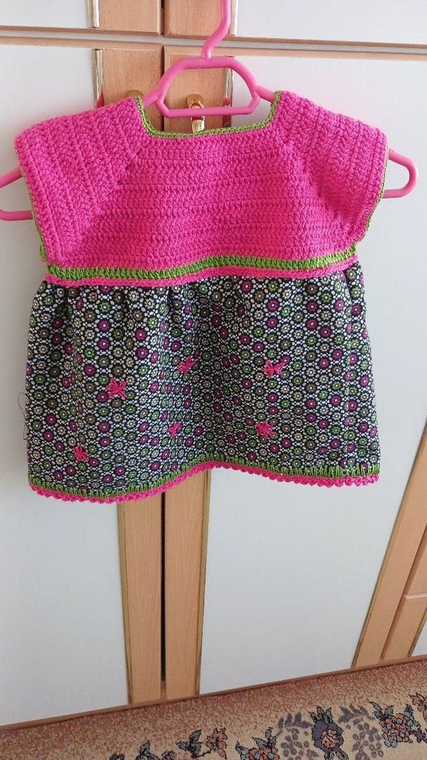 Örgü pembe üst kısmı ve renkli, bol kesim desenli etek kısmı olan kolsuz bohem kız çocuk elbisesi.sayfamdaki numunedir .isteğe ve yaş durumuna göre örmekteyimetek kısmı pazen kumaştır.