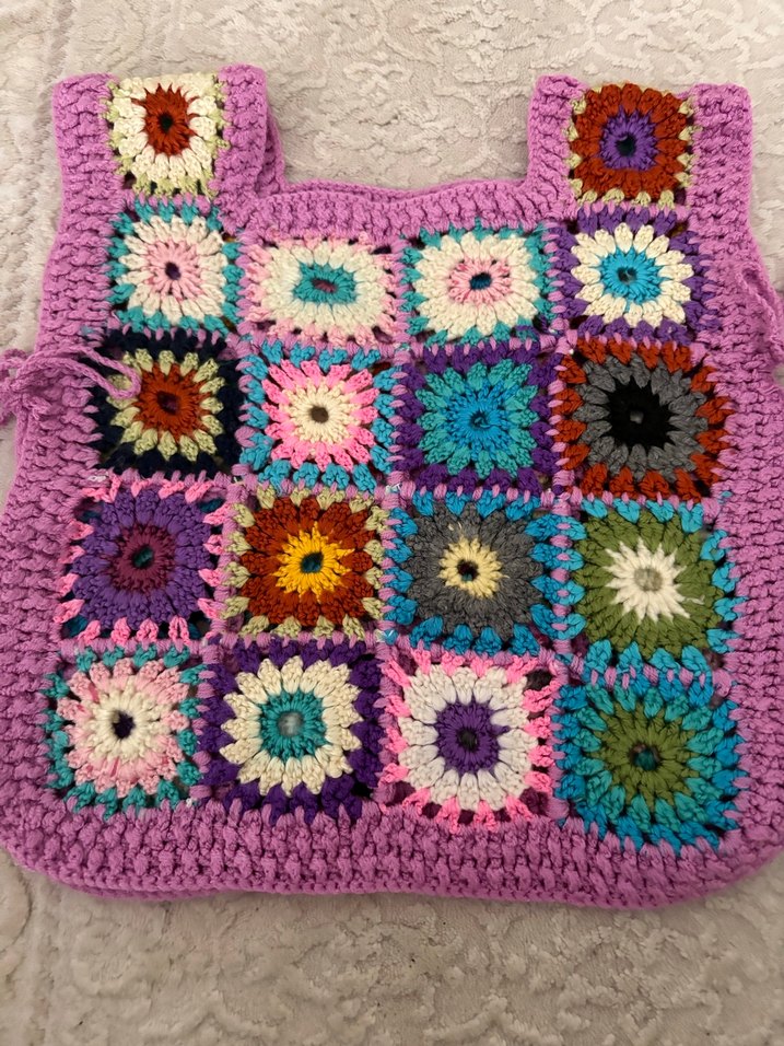 Renkli, örgü kız çocuk süveter, salaş kesim ve tekne yakalı, bohem tarzda desenli model.