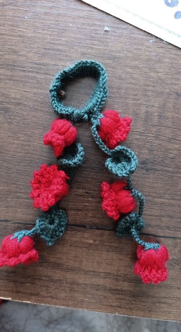 Canlı kırmızı ve yeşil çiçek detaylarına sahip, örgü toka. Bohem tarzda, rahat ve retro bir görünüm sunar.