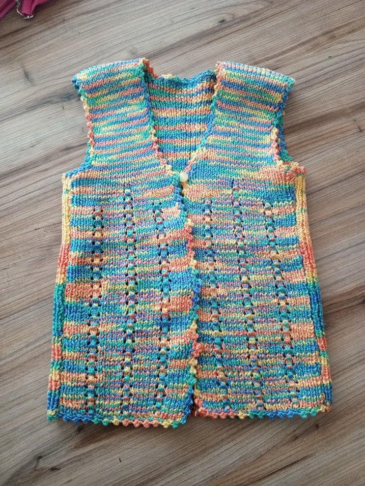 Renkli ipliklerle örülmüş, V yaka ve kolsuz, bohem tarzda kız çocuk için dar kesim yelek 4_5 yaş uyumlu