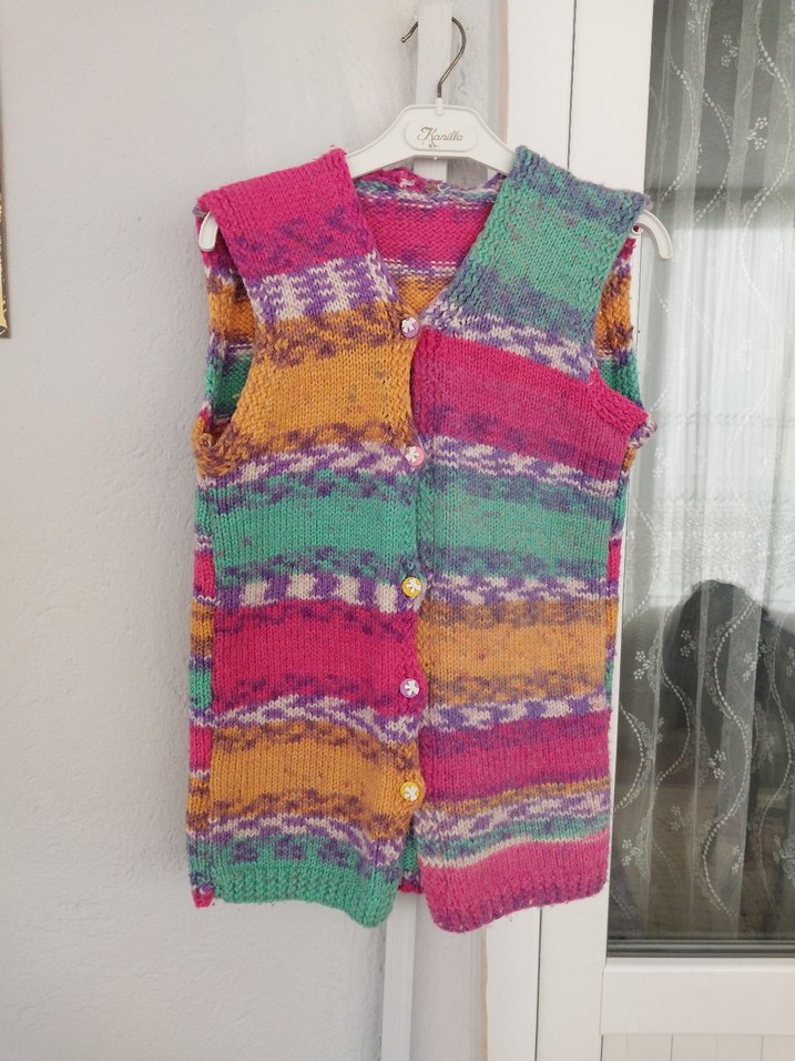 Renkli tie-dye desenli, yuvarlak yaka, kolsuz, bol kesim örgü kız çocuk yeleği. ön kısımlarında çok hafif tüylenme vardır kullanımı engel değildir başka sorun yoktur 8 yaştan 11 yaşa kadar olabilir