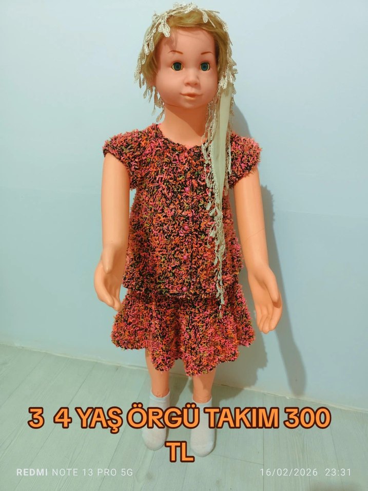 Renkli örgü kumaştan yapılmış, bol kesim ve fırfırlı detaylara sahip kolsuz kız çocuk elbisesidir. Bağlama desenli, yuvarlak yaka ve bohem tarzda bir modeldir.