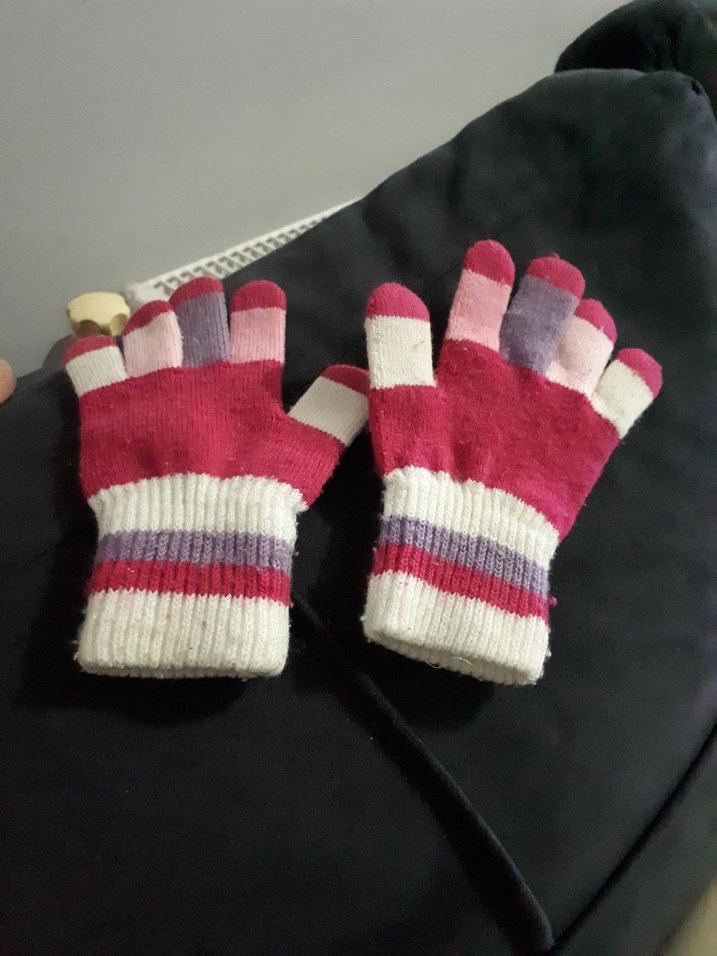 Yumuşak kürk dokulu, pembe, mor ve beyaz tonlarında çizgili renkli örgü kız eldiveni. 1 yaştan 4 yasa uyumlu kusuru deligi yok zaten 2 yada 3 kez giyildi