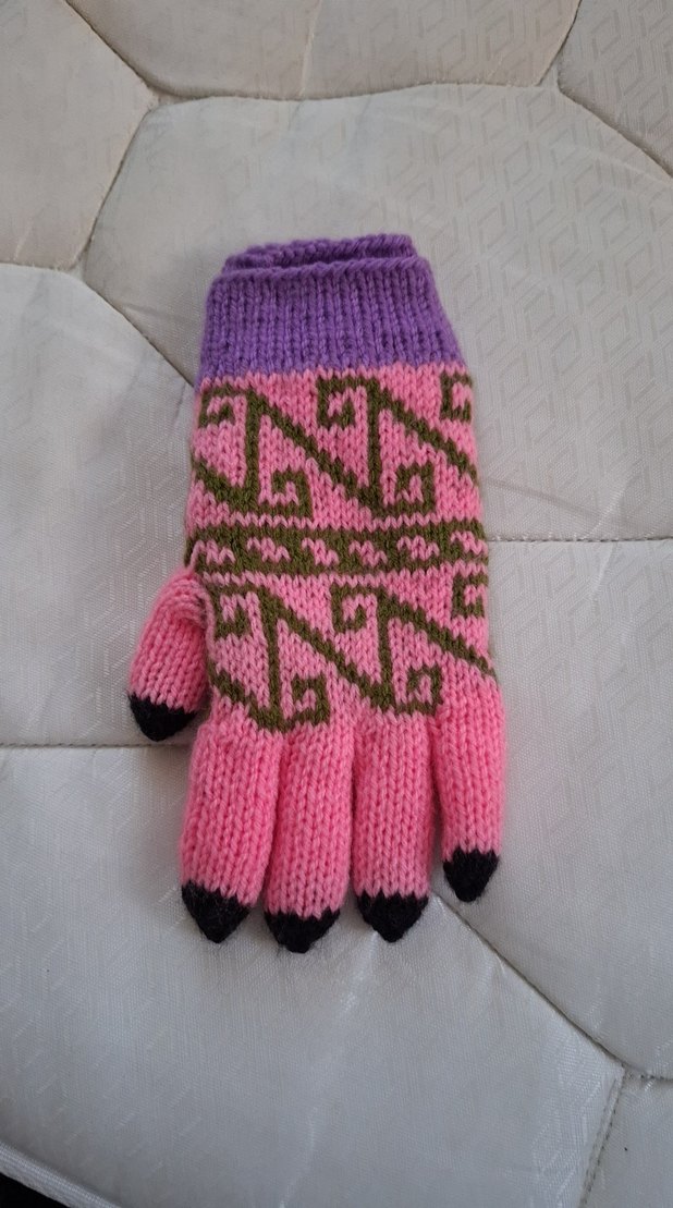 Renkli pembe ve mor tonlarında, örgü kız eldivenleri. Bohem tarzda, benzersiz örgü deseni ve yumuşak dokuya sahip.