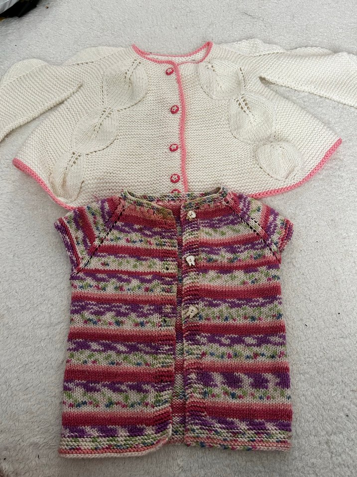 İki adet örgü kız hırkası; biri pembe düğmeli beyaz, diğeri kısa kollu renkli desenli,