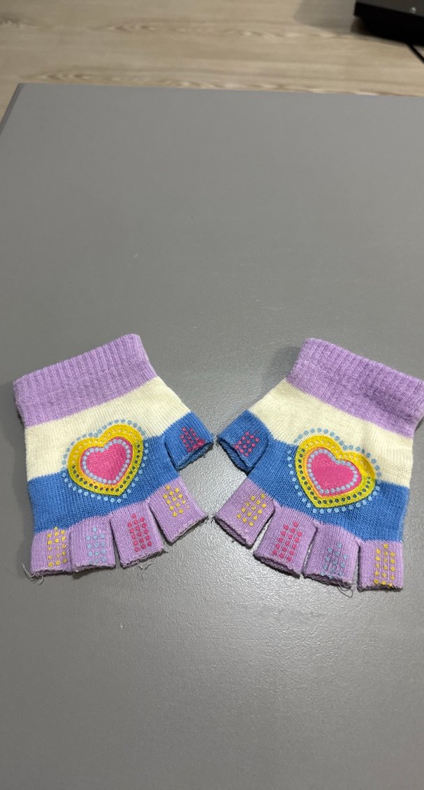 Renkli çizgiler ve nakışlı kalp desenleriyle kızlar için örgü parmaksız eldiven. Yumuşak dokulu, retro bohem tarzda.