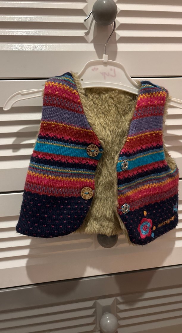 Renkli, örgü kız yeleği, bohem tarzda, fitted kesim, yuvarlak yaka ve kolsuz. Ahşap düğmeler ve yumuşak iç astar içerir.