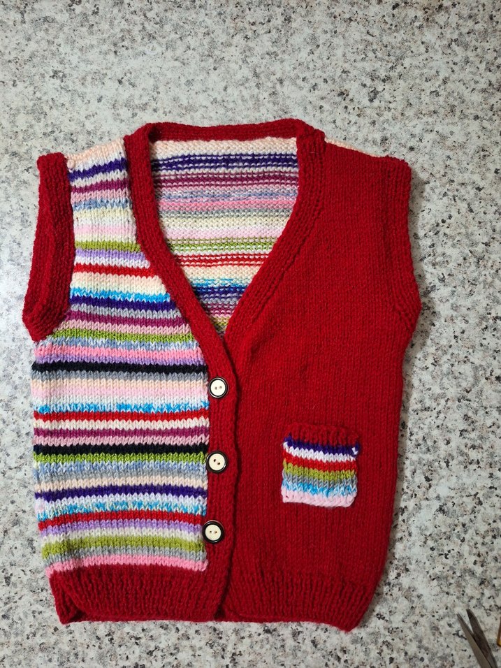 Renkli örgü kız yeleği, V yakalı ve kolsuzdur. Yeleğin yarısı kırmızı, diğer yarısı ve küçük cepli kısmı canlı renkli çizgilidir.