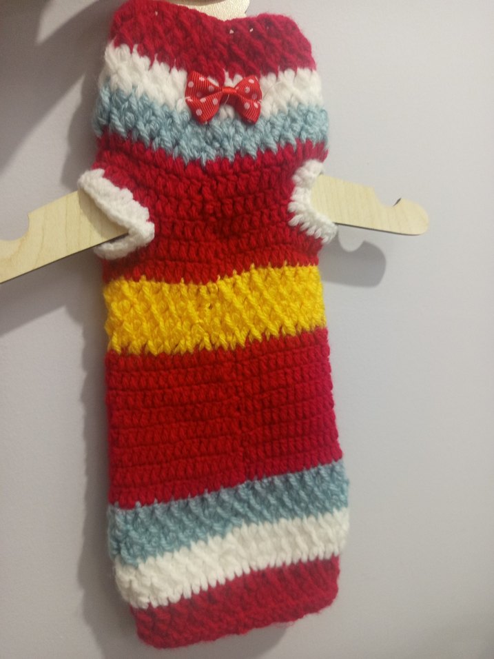 Yumuşak dokulu, kırmızı, sarı, mavi ve beyaz renklerde çizgili renkli örgü köpek kazağıdır. Sırtında küçük kırmızı fiyonk detayı bulunur.