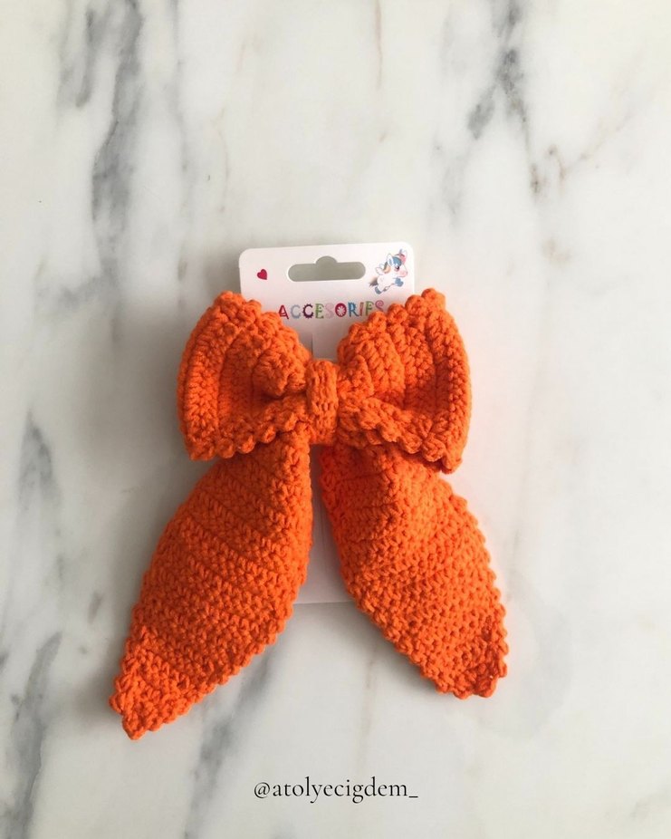 Renkli örgü kumaştan yapılmış, fiyonk detaylı turuncu saç tokası, sade ve bohem tarzlara uygundur. İstenilen renkte hazırlanır iletişime geçebilirsiniz.