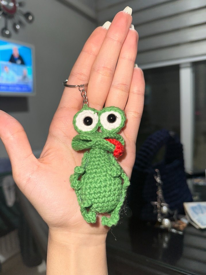 Renkli örgüyle yapılmış, bohem ve rahat tarzda eğlenceli kurbağa anahtarlık.