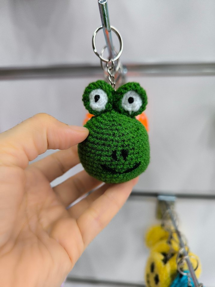 Renkli yeşil örgü kurbağa tasarımına sahip, minimalist ve rock punk tarzına uygun anahtarlık.
