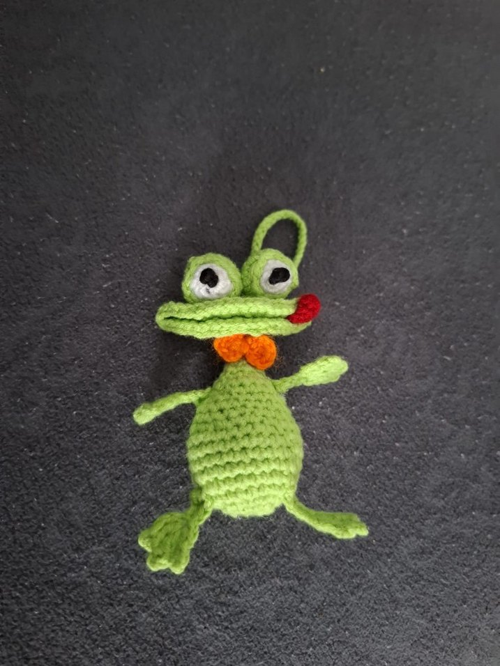 renkli örgü peluş oyuncak, büyük gözlü ve turuncu papyonlu yeşil bir kurbağadan oluşur, oyuncak olarak kullanılabilir. çanta charm, anahtarlık araba süsü, kalemlik süsü isteğe göre farklı hayvanlar da örülebilir.