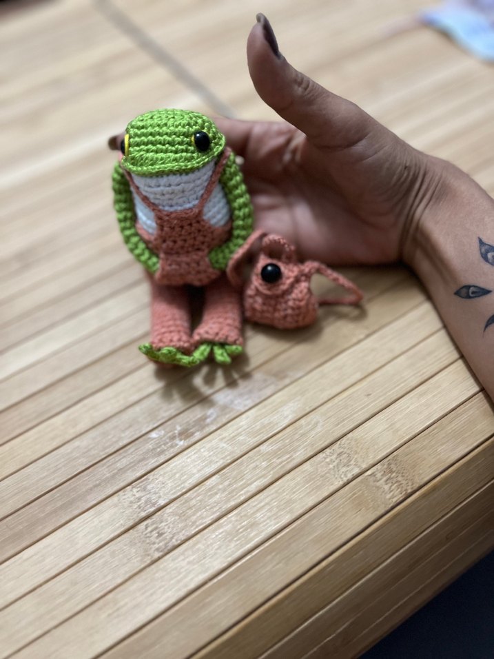 Yumuşak iplikten örülmüş, küçük aksesuarı olan renkli kurbağa peluş oyuncak. Koleksiyon veya hediye için uygun.