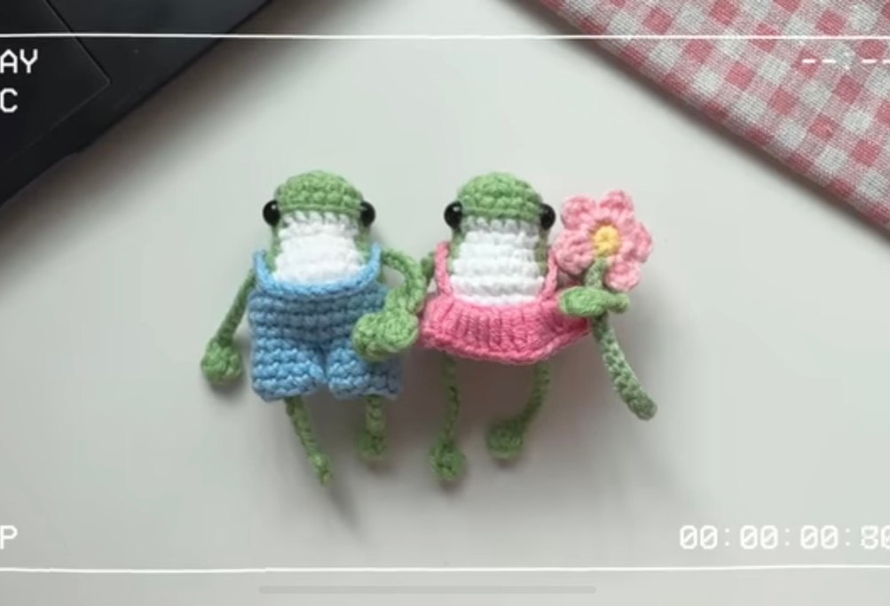 Mavi ve pembe kıyafetli, biri çiçek tutan renkli örgü kurbağa peluş oyuncaklar. Yumuşak ve el yapımı canlı iplikten yapılmıştır. Tek fiyattır