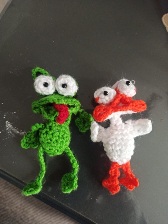 Büyük gözlü, yumuşak ipten yapılmış renkli örgü kurbağa ve ördek figürleri. anahtarlık tek fiyatı