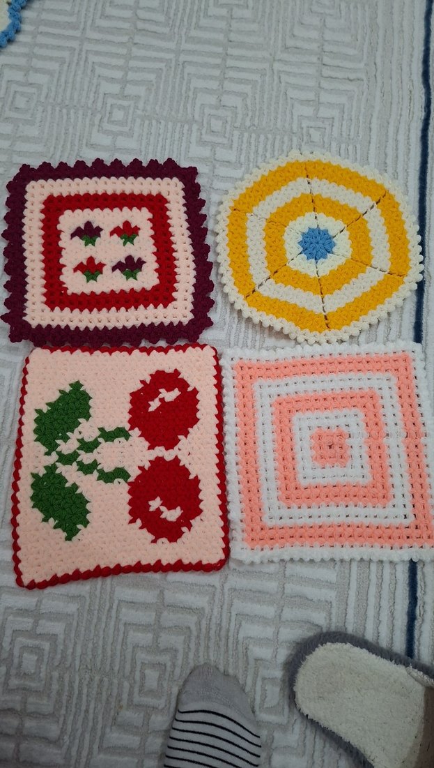 Çiçek ve geometrik desenlere sahip çeşitli kare ve yuvarlak renkli örgü çeyizlik lifler