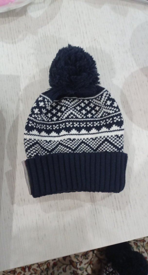 örgü, renkli mavi tonlarda desenli, üstünde ponpon bulunan rahat ve şık bir bere. ❄️