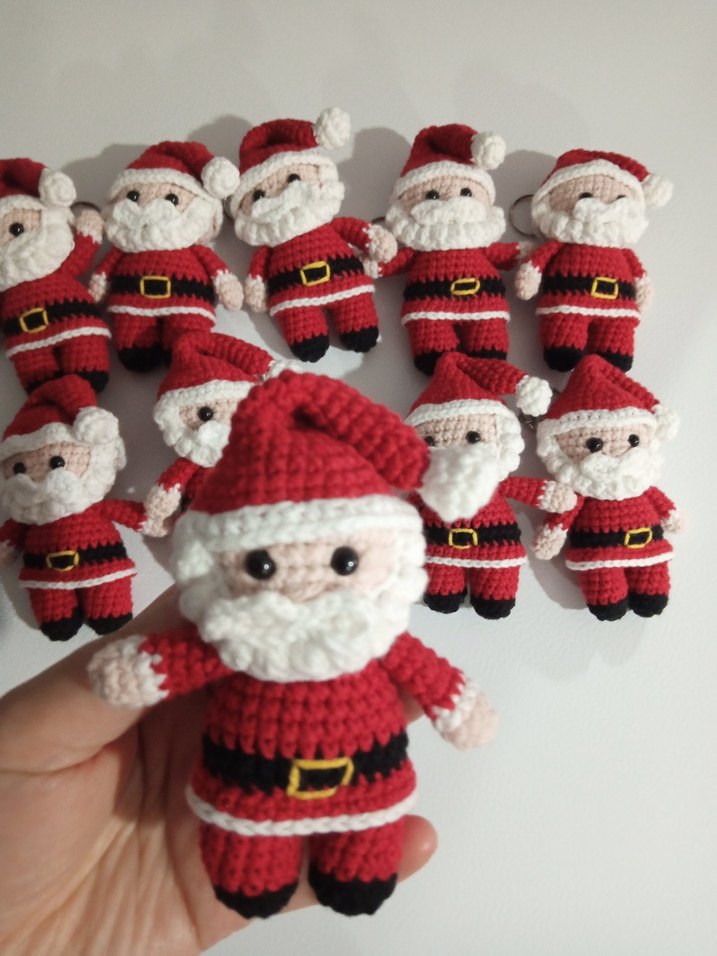 Detaylı kırmızı kıyafetli, beyaz sakallı renkli örgü mini Noel Baba figürleri, yılbaş dekorasyonları için uygun.