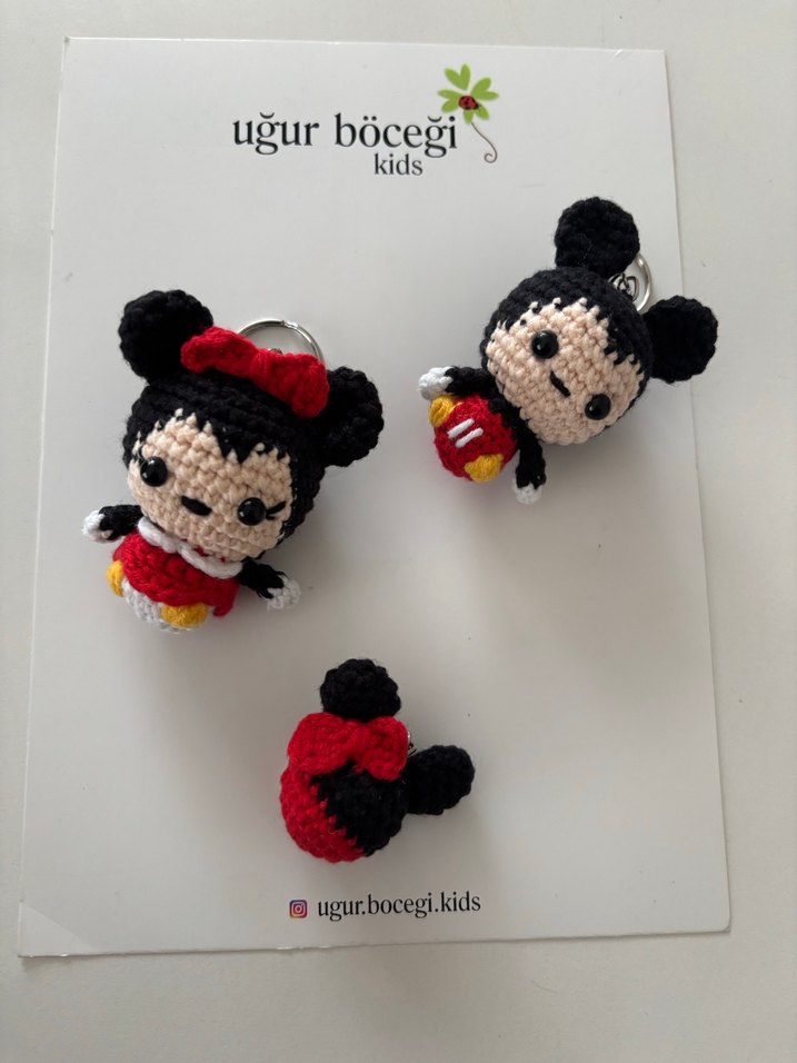 Renkli örgü Minnie Mouse figürlü üçlü anahtarlık seti, kırmızı ve siyah detaylara sahip, rahat pop kültür tarzında. Müşterimizin seçtiği iki ürün ile 3.ürünü biz tamamladık sevimli bi seti oluşturduk sizde sipariş oluşturmak için geç kalmayınız